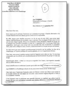 Un malheur n’arrive jamais seul. Pendant que le maire du Lamentin a fort à faire avec ses conseillers municipaux, il est dans le même temps rappelé à l’ordre par la gauche alternative dont il est en principe le patron. Avec une certaine affection mais fermement quand même, Jacques Kancel, Florent Mittel, Jean-Marie Hubert, et Adrien Baron dans une lettre où ils lui reprochent son mutisme voire son effacement, mettent l’accent sur son comportement et lui demande de « suivre un traitement ». Une manière à peine voilée de lui signifier qu’il est malade et qu’il doit se faire soigner. Voir fac similé d’un extrait de la lettre. Le coup est rude.